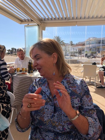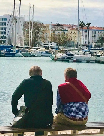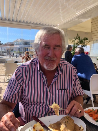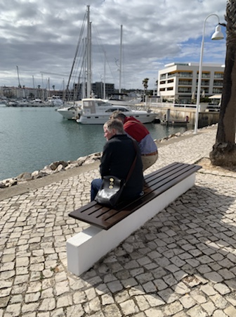 The end of the Second World War brought the “baby boom“ which included my dear hubby. Roger Edward Cawdron born 25th Feb 1945. He often tells me part of Norwich was bombed that day but they narrowly missed the nursing home where he was born. Today he wakes very early like a child at Christmas. Poking me and asking if it’s too early for tea, it’s not even daylight. I snooze until 6.45 then give in and agree. While he is making the tea I empty my post bag of the family cards brought with me from the uk. The cards include one from Judy who posted it under the door at some silly hour due to being an insomniac …. I try Wordle which is ridiculously hard after my amazing success yesterday and I give up! We enjoy a leisurely cuppa in our luxurious bed, I am not keen to leave it today. DT has gone off to the daily Physio. The sun is out so we open the French windows and enjoy the warm air. Judy is at the other end of the house. Her room opens up on to the pool area. Next to her room is the wet bar. A fully functioning kitchen with coffee maker etc so we can help ourselves without waking the whole household. Rita appears from her suite looking her usual dazzling picture of health so I decide I must sort my grey roots and apply this hair dye. Rita obliges with an old towel that I can use in case of spills. It is not necessarily an old towel in my sense but at least it is not the beautiful pristine white ones given to us on arrival. Either way I apply said hair dye, trying to establish the Portuguese instructions. As Judy remarked, when you buy products in the uk they always contain many different languages. Not in this case, it’s all Portuguese! I guestimate it all and whilst the dye is working DT returns and serves Buck’s Fizz for Rogers birthday . Rogers wonderful chocolate birthday cake made by Rita’s fair hands is on full display, I feel I could dive straight in but Rita hands out lush freshly cooked crispy bacon & egg crusty rolls. After I finish my hair and finish my fizog. DT calls an Uber and we trot off into Lagos for the day. It’s a sunny day, around a comfortable 18c, a bit cloudy here and there. The driver drops us at the bus station. This has historic connotations for my family. In the early 1980’s when we visited there were not any restaurants as such but we found a canteen in the bus station. Our son a James probably aged 10 or 11 at the time ordered a soup from the menu. It was pure garlic with a poached egg floating in it. He ate the lot. He never did have a problem with strange food but we never forgot it and too this day often recollect the occasion. We walked along the front opposite the marina. It was far larger than I remember. We did stay here on our friends boat in a few years ago. I texted him to see if he was in residence but alas he is living in Guernsey and not available. No chance of a day at sea then! We pass a rather attractive woman’s wear shop, the boys leave us to peruse and find a bar. Judy purchases a rather lovely shirt dress top for a mere €18. We then catch up with the boys who are in a bar on the top of the fish market with amazing views of the marina. Phew 150 steps later we join them. After a vino or two we move on to the old town. We wander around the cobold streets and remaking how quiet it is. Still fabulous but it’s a pity tourism still has a long way to go to return to post covid. DT wants us to dine in the Canteena on the front. He has been a couple of times recently, lately with Nick D’Eath when he visited them. It’s nothing from the outside but inside it’s packed. Roger counts 120 covers and every seat is full. We have a fabulous meal of sardines, chips and salad washed down with lots of wine Roger pays the bill as it’s his birthday and we leave to walk towards the marina. We look for our friend’s boat and on the way we have a little drinkies. The bars on the marina seem much busier than in town. Both our children facetime their father for a birthday chat. James is in Florida with his family enjoying sun & golf no doubt. Joolia is at home with Snowy the husky pup – her new love. Both granddaughters send messages along with many friends. He is a lucky boy. We leave the bar and wander along the rest of the marina and find our friends boat. It’s in pride of place in a top spot by the best bars & restaurants. We all discuss the amount of mooring fees it must cost. We stop and take photos. Whilst we wait for an Uber to take us home we stop at yet another bar. Roger is desperate for a pee and most anxious that the loo seem engaged for a long time. He does a little dance and pretends to bang on the door. I suggest that he try the door handle again harder but before he can do that Rita gives him a hand & finds the door opens easily only to find it engaged. We all laugh hysterically…… as the man re enters the restaurant we try and stifle our amusement which makes thing worse. Back at Chateau Turnbull we settle down in our comfy clothes, eat some of Rita’s birthday cake and watch Tv for the rest of the evening. Well some of us did. The boys both doze. Thank you to all for a fabulous day.