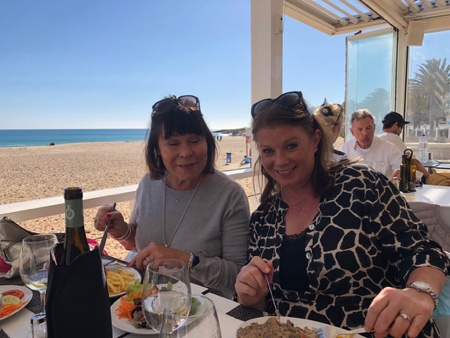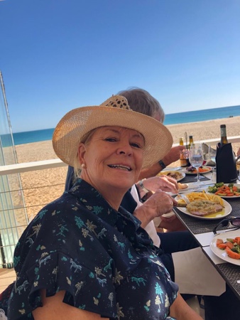 It is our hosts birthday. I have brought cards over from Norwich from some of David’s children so I pop these under his door. David leaves for his physio at 8am. It’s pouring with rain – not the best weather for a birthday. While he is out we shower and dress. I FaceTime with Joolia complaining I haven’t heard from her in days. She explains that her new little girl Snowy needs a long walk every morning at the time we normally speak! So I am taking second place but I don’t mind as the Gilveys are so loving their new addition. I Snapchat Aspen to wish her a good last day at her latest placement at Sheffield hospital. She now has a brief break to study before her next placement. I can’t believe she is almost through her second year as a student nurse. David returns with fresh bread rolls and croissants so we have a delicious breakfast and fresh coffee and decide what to do today. Due to the wind and rain it’s not exploring weather so we take it easy for an hour or two and watch Rita make a carrot cake – one of Davids favourites. Around midday the sun comes out so we drive to Davids favourite little bar in Espiche. We meet more of the Turnbull’s quirky friends here and enjoy an hour or so of banter. Rita then drives us into Luz to a restaurant called Latitude. We are just in time as the kitchen closes at 3pm. The menu is mainly tapas which three of us go for but Roger decides on a three course with his main dish being roast duck Portuguese style. To celebrate a famous man born in 1946 David picks a fabulous bottle of red wine from the Douro. Rita and I stick to the white wine. We then stroll along the prom to The Bull and enjoy a drink in the sun, meeting a guy called Jonathan who once lived in Mattishall Hall in Norfolk. Now well over the driving limit we leave the car and Uber home. A pleasant evening is spent in front of the fire watching TV eating carrot cake.