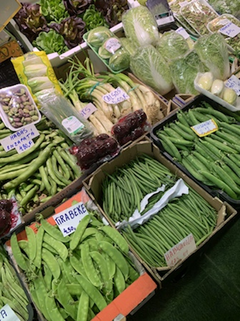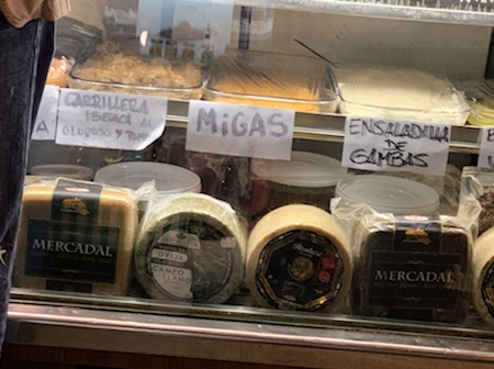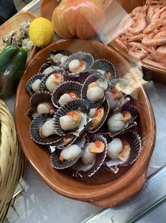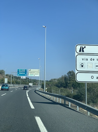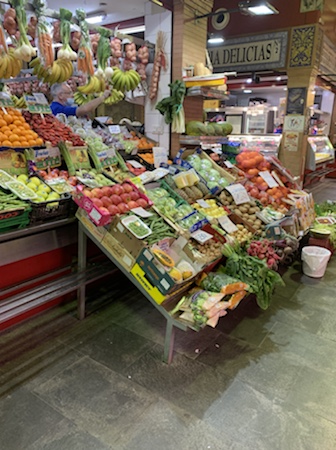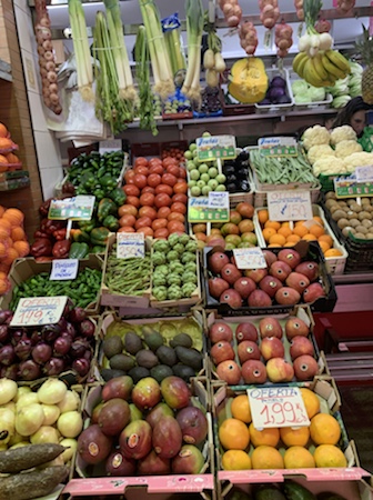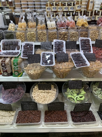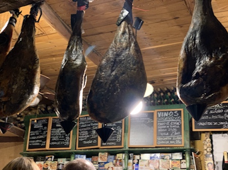 Wednesday morning we are woken by dustmen at 7am. Any slight noise in these narrow backstreets echo’s, much different from the day before which was a Holy holiday and very quiet. We pack and leave the apartment at 11.00 as DT has arranged a late check out for us. We turn in a different direction today and stumble across a wider lively street with many café bars and shops. We have breakfast much the same as yesterday in a traditional Spanish café again the ceiling full of drying hams. A lovely cheerful seniorita serves us. We wander on through this pretty esplanade Rita buys some delicious looking epinadas for our friend Joe who we are meeting later. We visit the market. We all say we could spend a day in the market trying out all the little tapas bars. The food looks awesome. Time is getting on so we head back to the apartment where Rita and I sit on the sun terrace and wait for the boys to collect the car. Time to leave this wonderful city. All of us decide our visit has been so enjoyable that we plan to visit again soon. Rita drives us back to Portugal. The scenery is wonderful. We pass olive groves and many orange trees. The land looks very dry. They are seriously in need of rain in the this part of the world. Especially Portugal. David tells us there is a serious water shortage here which is very alarming.